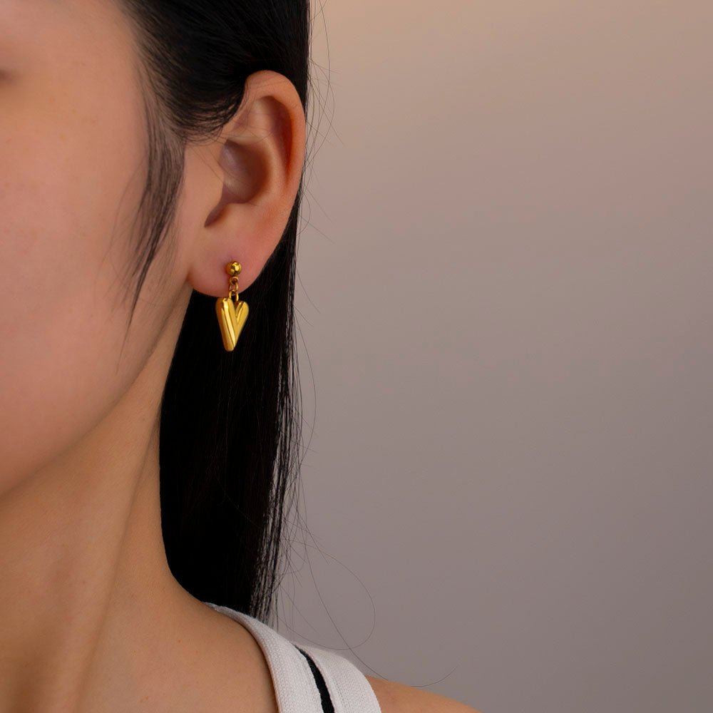 Crafted from 316 stainless steel with 18K real gold vacuum plating, these earrings feature a heart pendant design, exuding a romantic and elegant vibe. Minimalist yet meaningful, they are durable and tarnish-resistant, perfect for everyday wear or special occasions, showcasing femininity and charm.